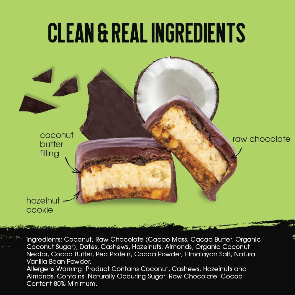 Coconut, Raw Chocolate (Cacao Mass, Cacao Butter, Organic Coconut Sugar), Dates, Cashews, Hazelnuts, Almonds, Organic Coconut Nectar, Cocoa Butter, Pea Protein, Cocoa Powder, Himalayan Salt, Natural Vanilla Bean Powder. Allergens Warning: Product Contains Coconut, Cashews, Hazelnuts and Almonds. Contains: Naturally Occurring Sugar. Raw Chocolate: Cocoa Content 80% Minimum.