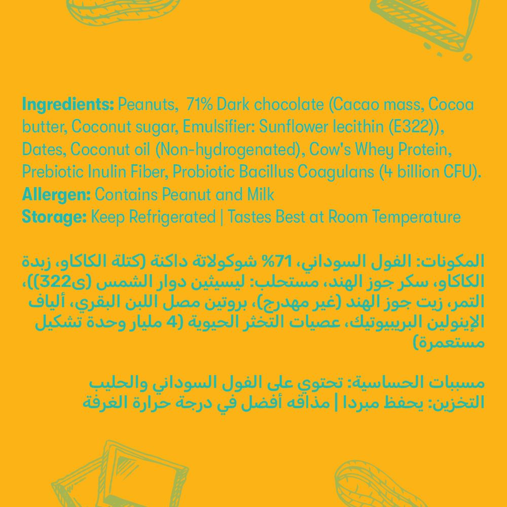 Peanuts, 71% Vegan dark chocolate (Cacao mass, Cocoa butter, Coconut sugar, Emulsifier: Sunflower lecithin (E322)), Dates, Coconut oil (Non-hydrogenated), Grass Fed Whey Protein, Prebiotic Inulin Fiber, Probiotic Bacillus Coagulans (1.25 billion CFU)